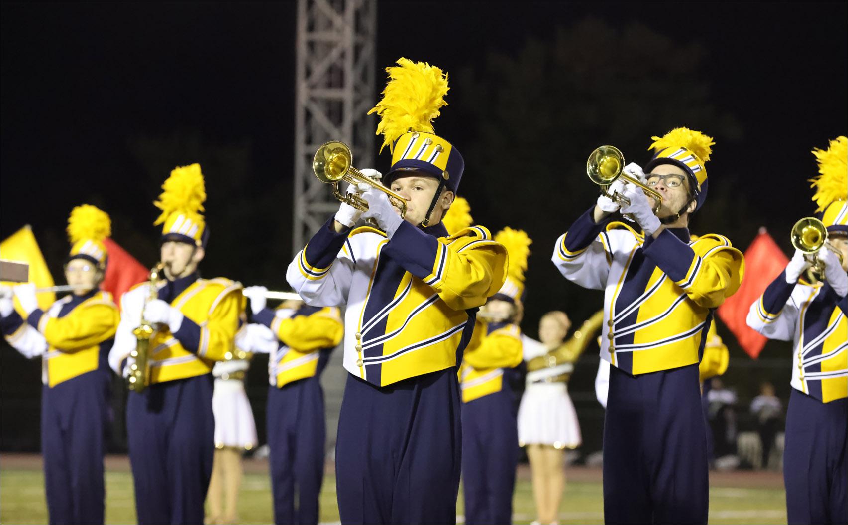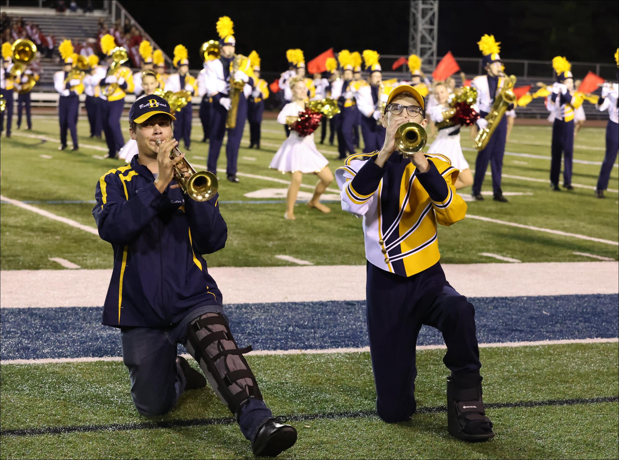 Nursing injuries, Alecx Colins (left) and Blake Bernosky still performed with their Goldent Tornado Marching Band mates at the Butler County Band Festival Wednesday Sept. 29.