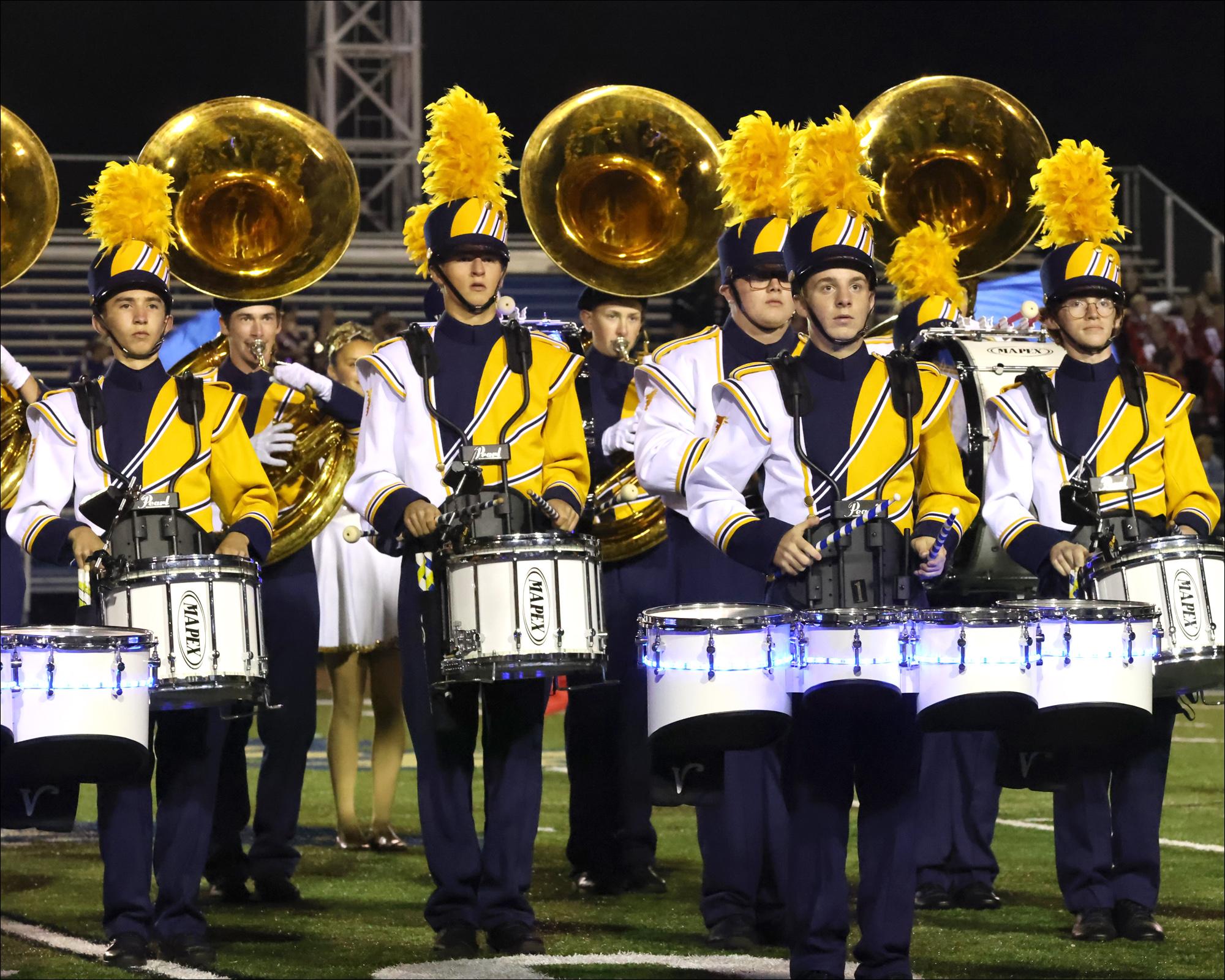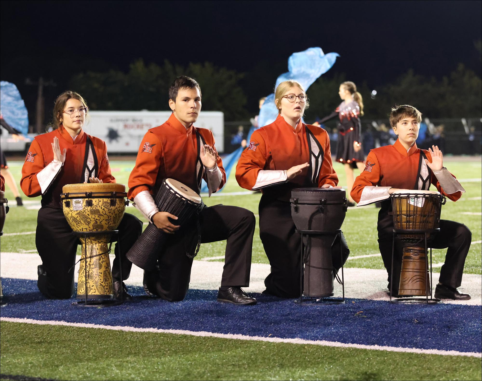 SLIPPERY ROCK - Members of the Slippery Rock High School Rocket Marching Band's percussion section beat their drums from a knee.
