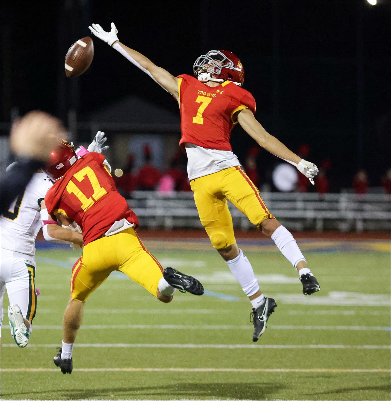 North Catholic defensive back Gavin Kamody (7) tips a pass intended for a Deer Lakes receiver Friday.