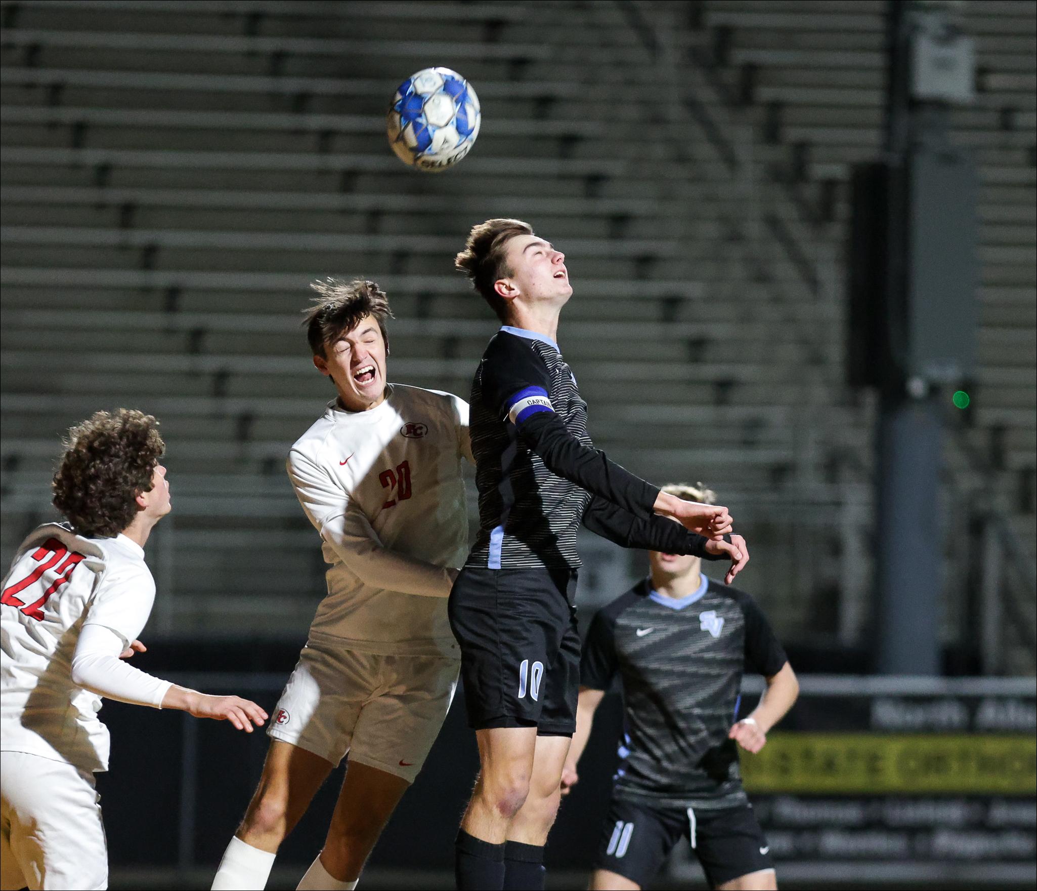 Seneca Valley midfielder Nathan Prex (10) battles for a header with Fox Chapel defender Ashton Schutzman in the WPIAL 4A boys soccer semifinals Tuesdayu night. Prex scored the game's only goal — breaking the school record in the process — in the Raiders' win. Nathan Black/Special to the Eagle
